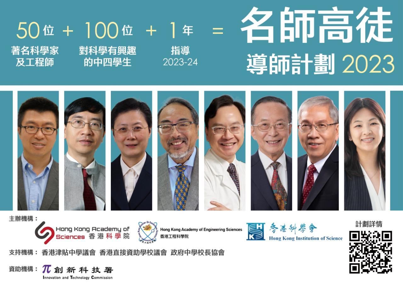 為培育新一代對科學的興趣及熱情,吸引更多年輕人在科技界發展,成為科技人才,香港科學院、香港工程科學院及香港科學會邀請約50位著名科學家及工程師,為約100名對科學有興趣、有志投身科技界的高中學生擔任義務導師,就其生涯規劃互相交流,協助他們走上成功的科學之路。本計劃為期1年,每位導師將帶領2至3位學員,進行交流活動或聚會。香港科學院亦將組織不同的學習活動(包括科學講座、研討會及工作坊)*,供所有學員及導師參加,以促進不同小組學員的交流互動,同時讓導師就學員的學習過程給予適切的輔導。學員須參加最少2次的活動,並提交中期及總結報告,方獲發證書。參與本計劃之導師包括:徐立之教授、盧煜明教授、袁國勇教授、任詠華教授、岑浩璋教授、馬桂宜博士等等。